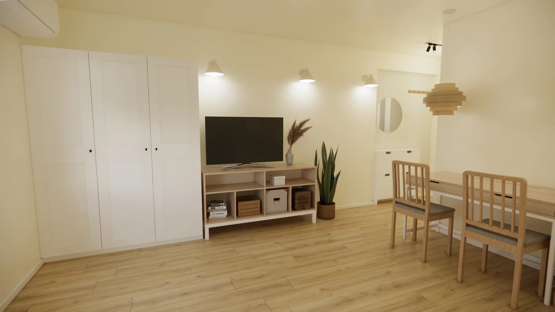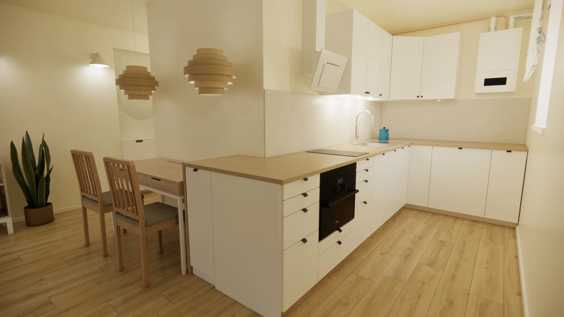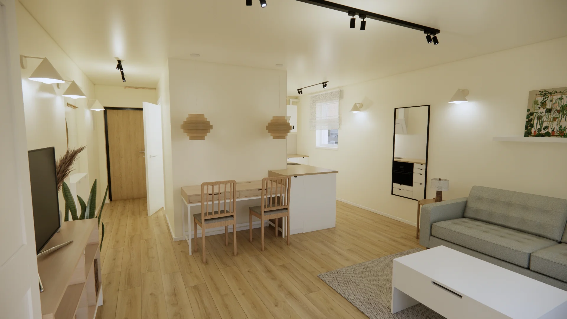 Zdecydowaliśmy się wszystkie ściany i sufity pomalować na kolor złamanej ciepłej bieli, podłogę wymienić na taką w odcieniu ciepłego, naturalnego drewna. Kuchnia także zyskała nowy układ i stała się zabudową zamieniającą się w przestrzeń jadalnianą.