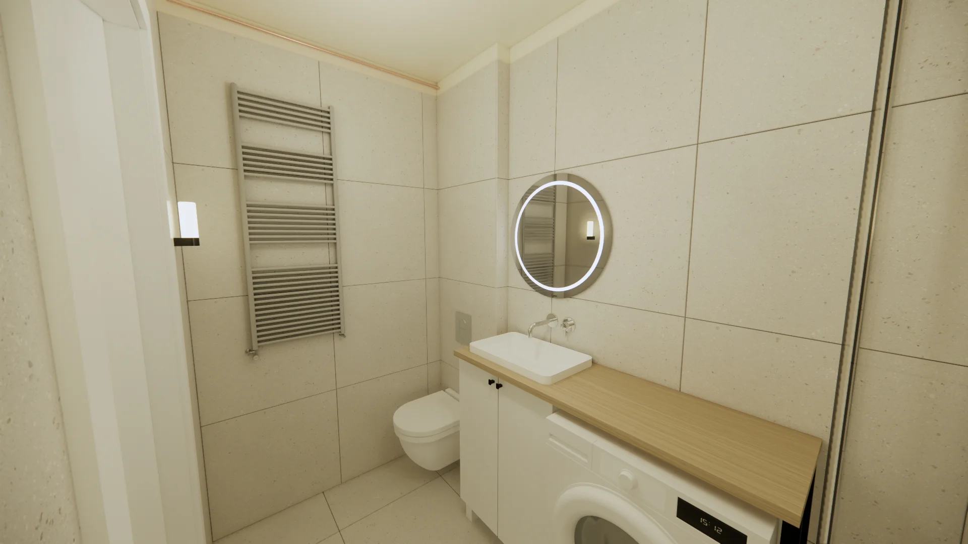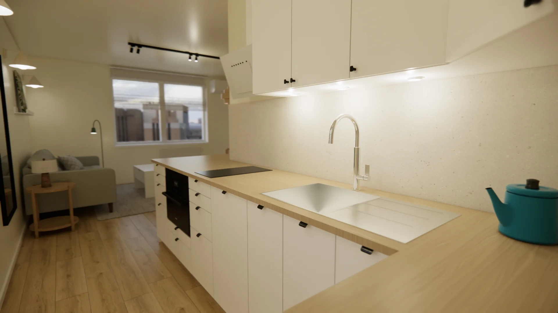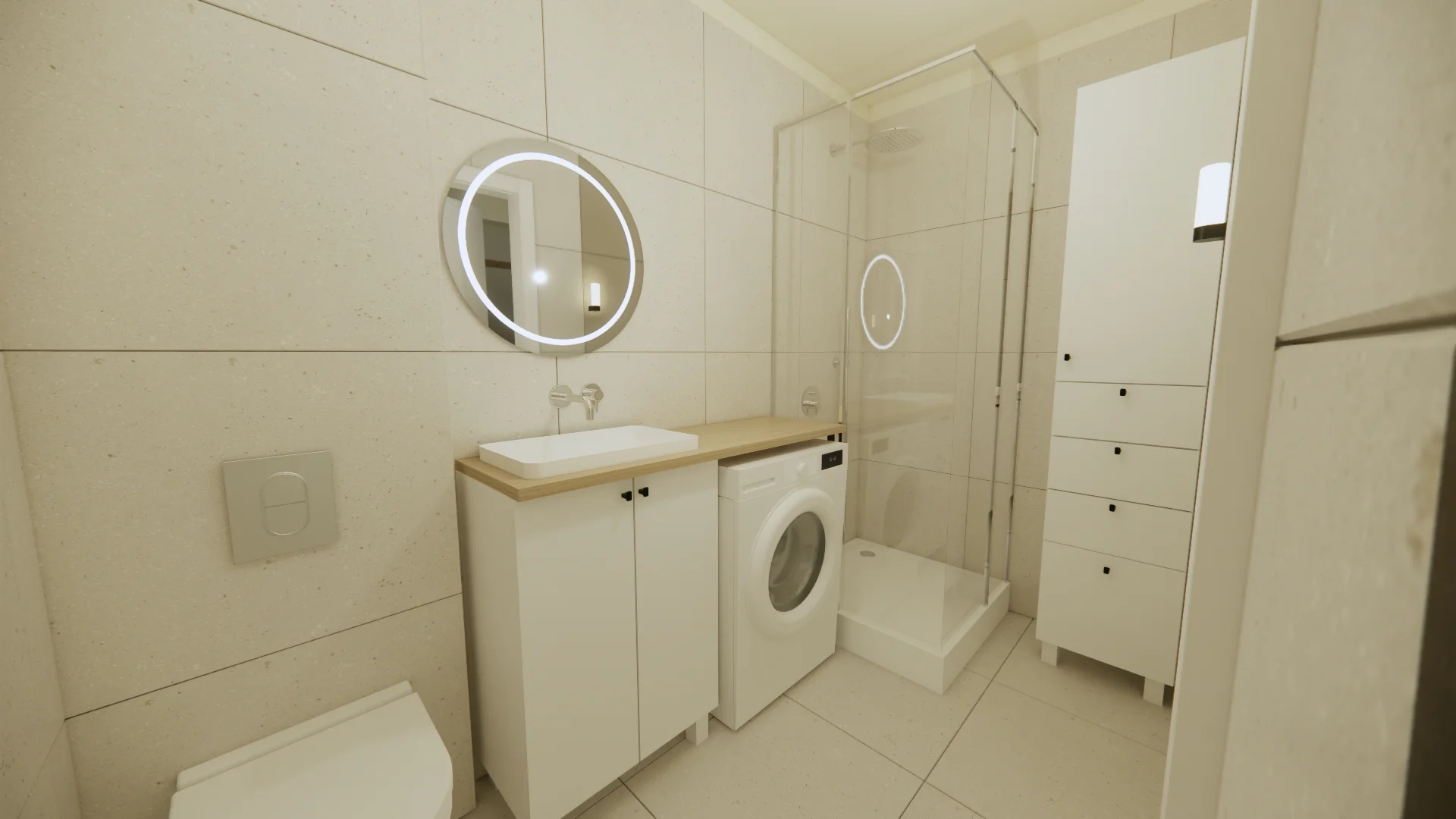 Rozkładana wygodna sofa z materacem, rozkładany stolik kawowy – wiele rozwiązań do małych przestrzeni, które pełnią wiele funkcji. W łazience, mimo ograniczonej przestrzeni, znalazło się miejsce na pralkę i wygodną kabinę prysznicową.