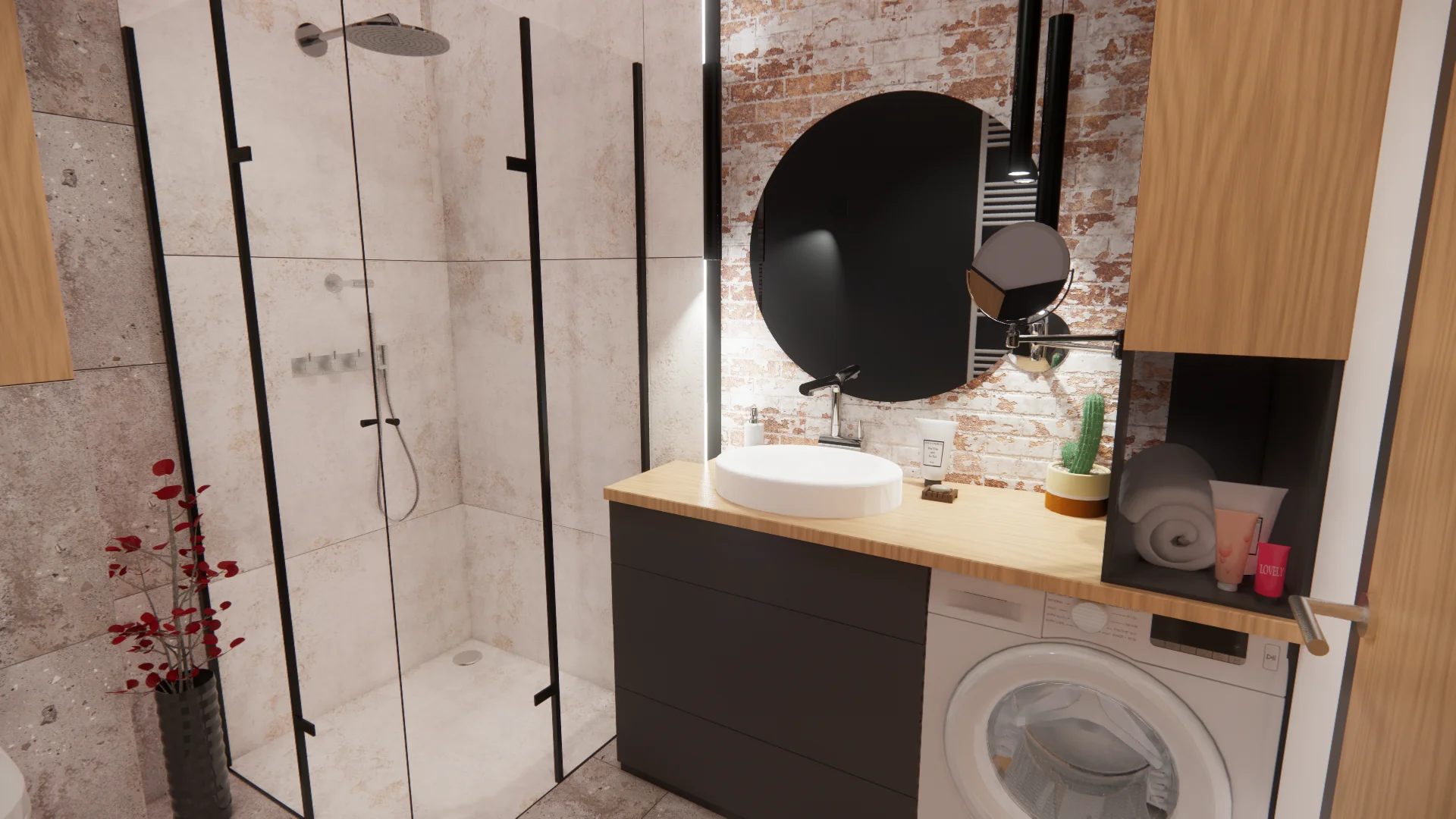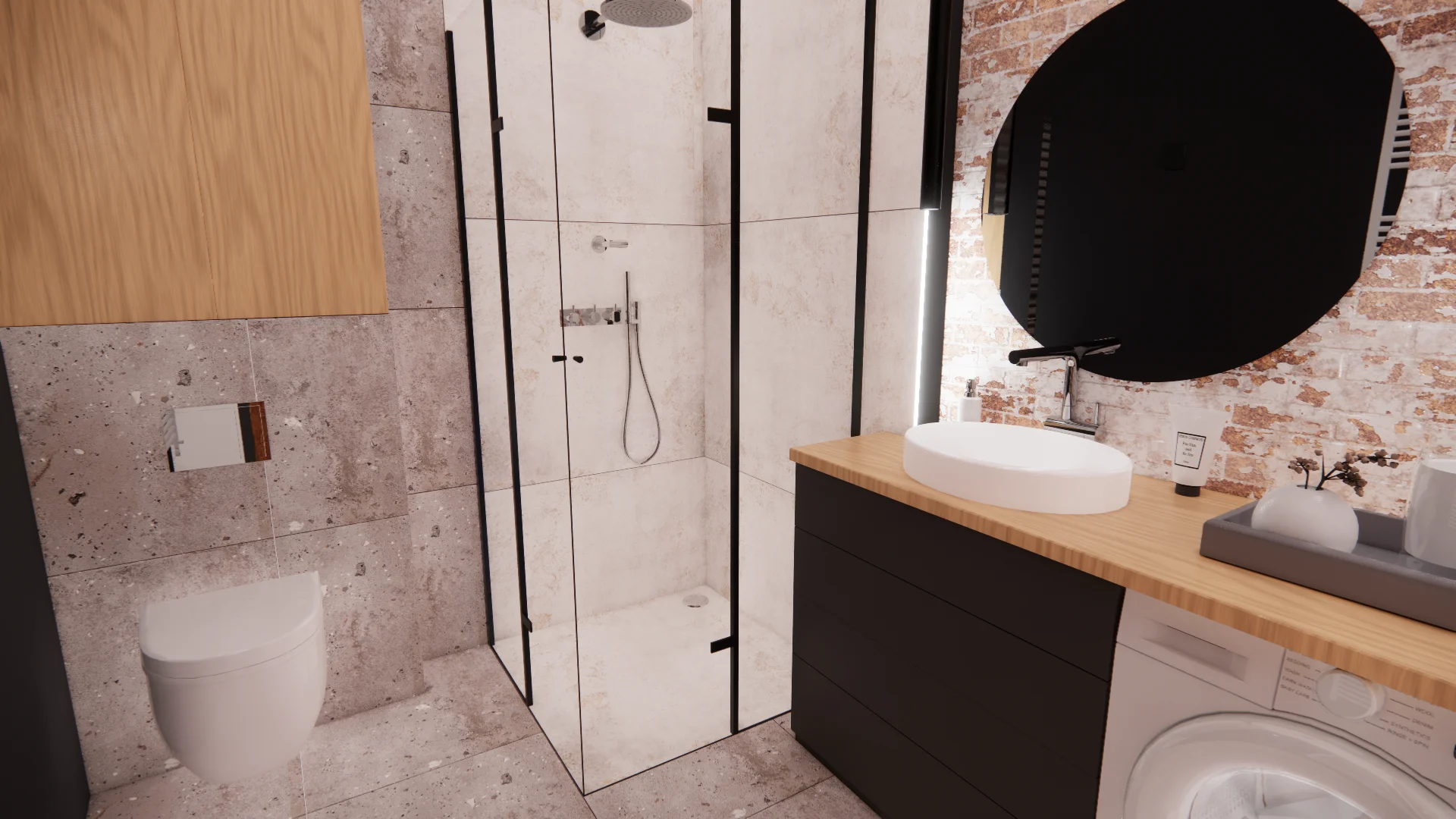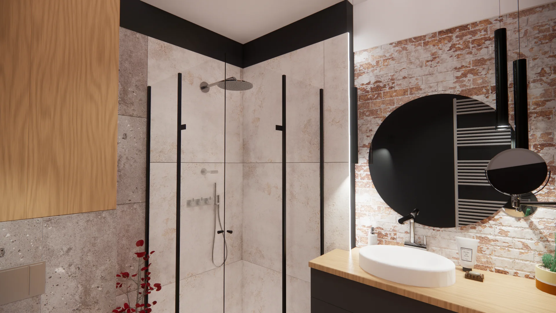 Całość otrzymała styl loftowy – a dokładniej współczesny z elementami stylu industrialnego. Za lustrem ściana obłożona cegłą, czarne ściany i sufit, płytki imitujące beton i kamień. Dodatkowe oświetlenie, którego brakowało w łazience przed remontem. Nierówności ścian, charakterystyczne dla budownictwa tego budynku, stały się elementem dekoracyjnym, w którym ukryliśmy dodatkowe punkty świetlne.