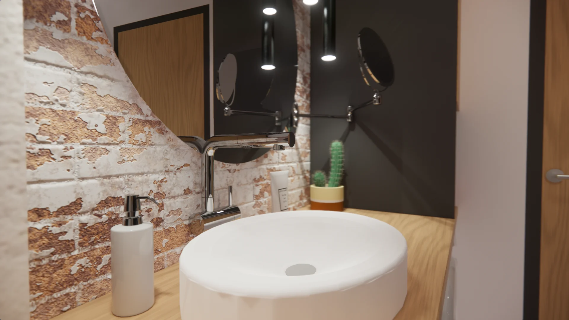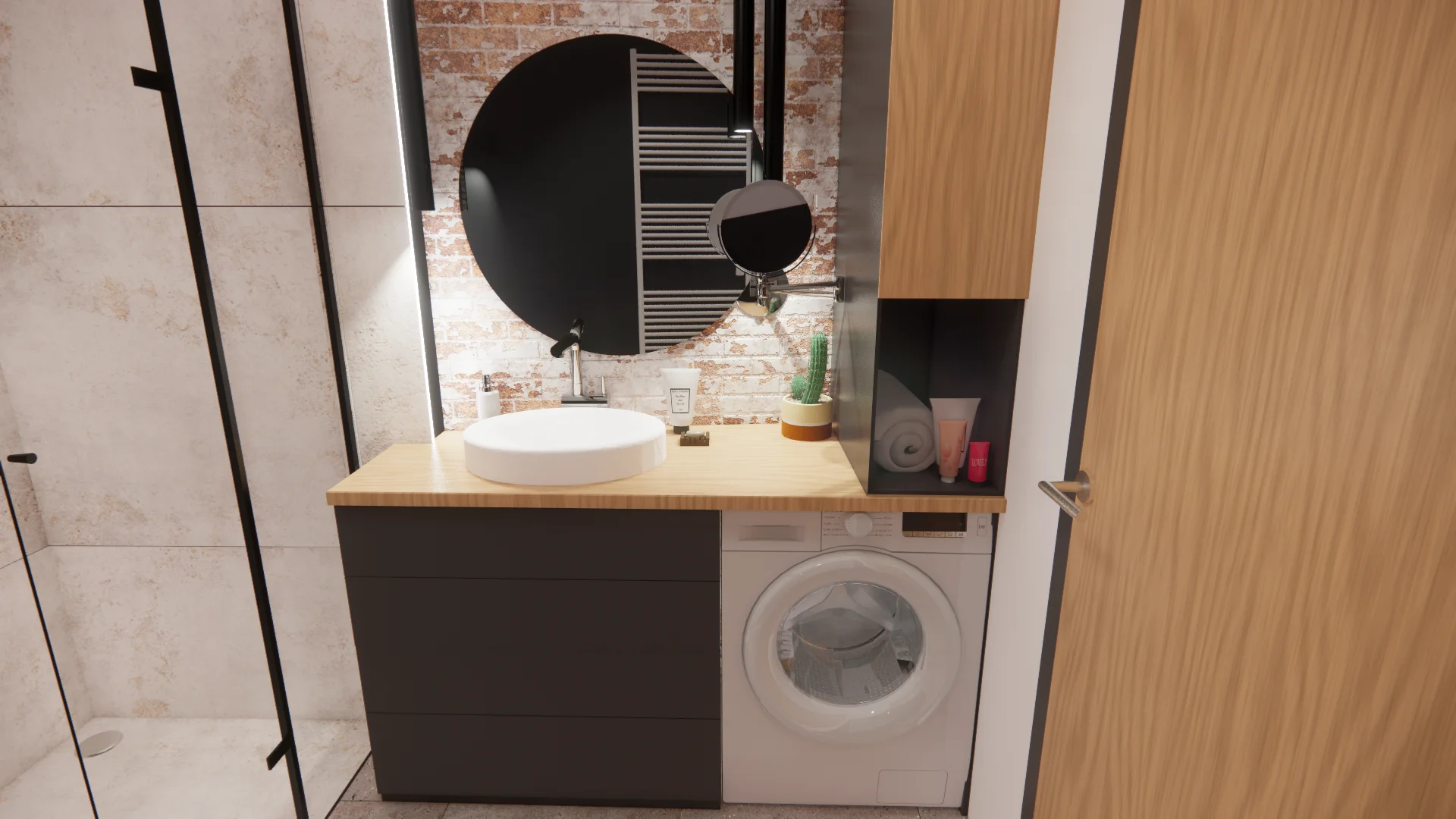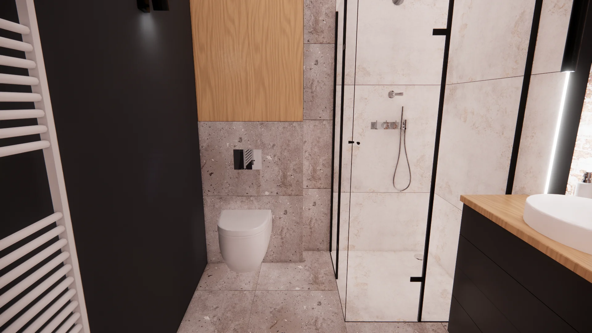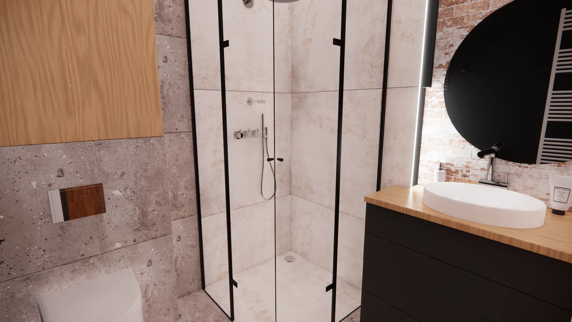 Całość otrzymała styl loftowy – a dokładniej współczesny z elementami stylu industrialnego. Za lustrem ściana obłożona cegłą, czarne ściany i sufit, płytki imitujące beton i kamień. Dodatkowe oświetlenie, którego brakowało w łazience przed remontem. Nierówności ścian, charakterystyczne dla budownictwa tego budynku, stały się elementem dekoracyjnym, w którym ukryliśmy dodatkowe punkty świetlne.