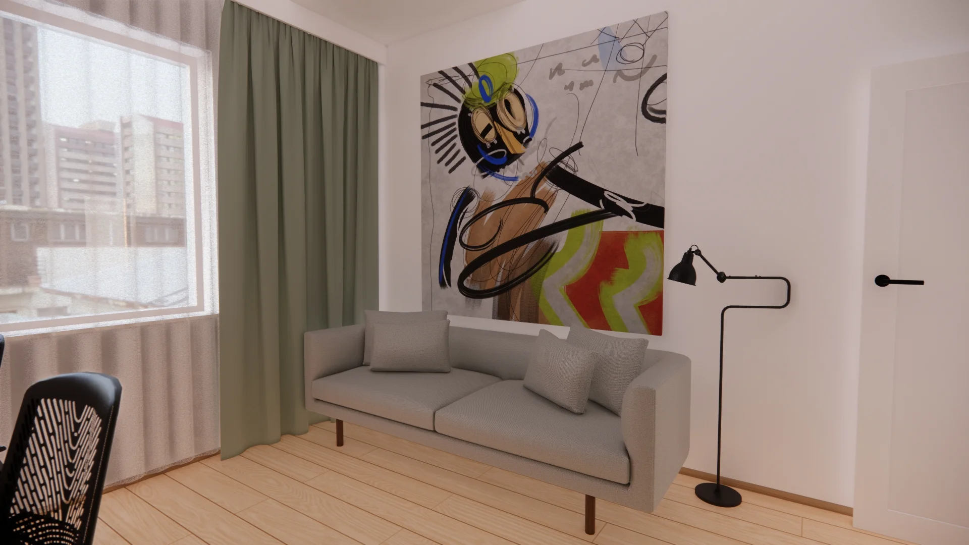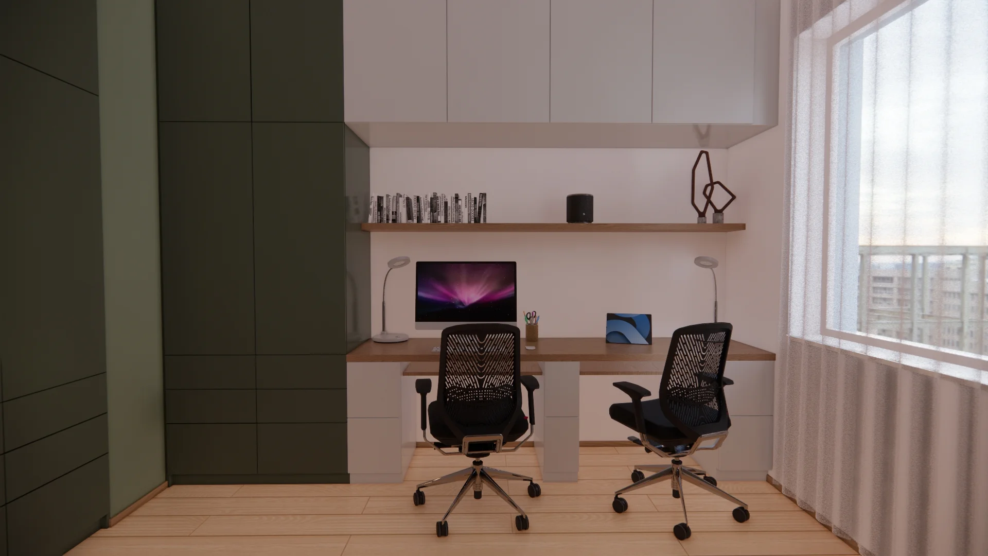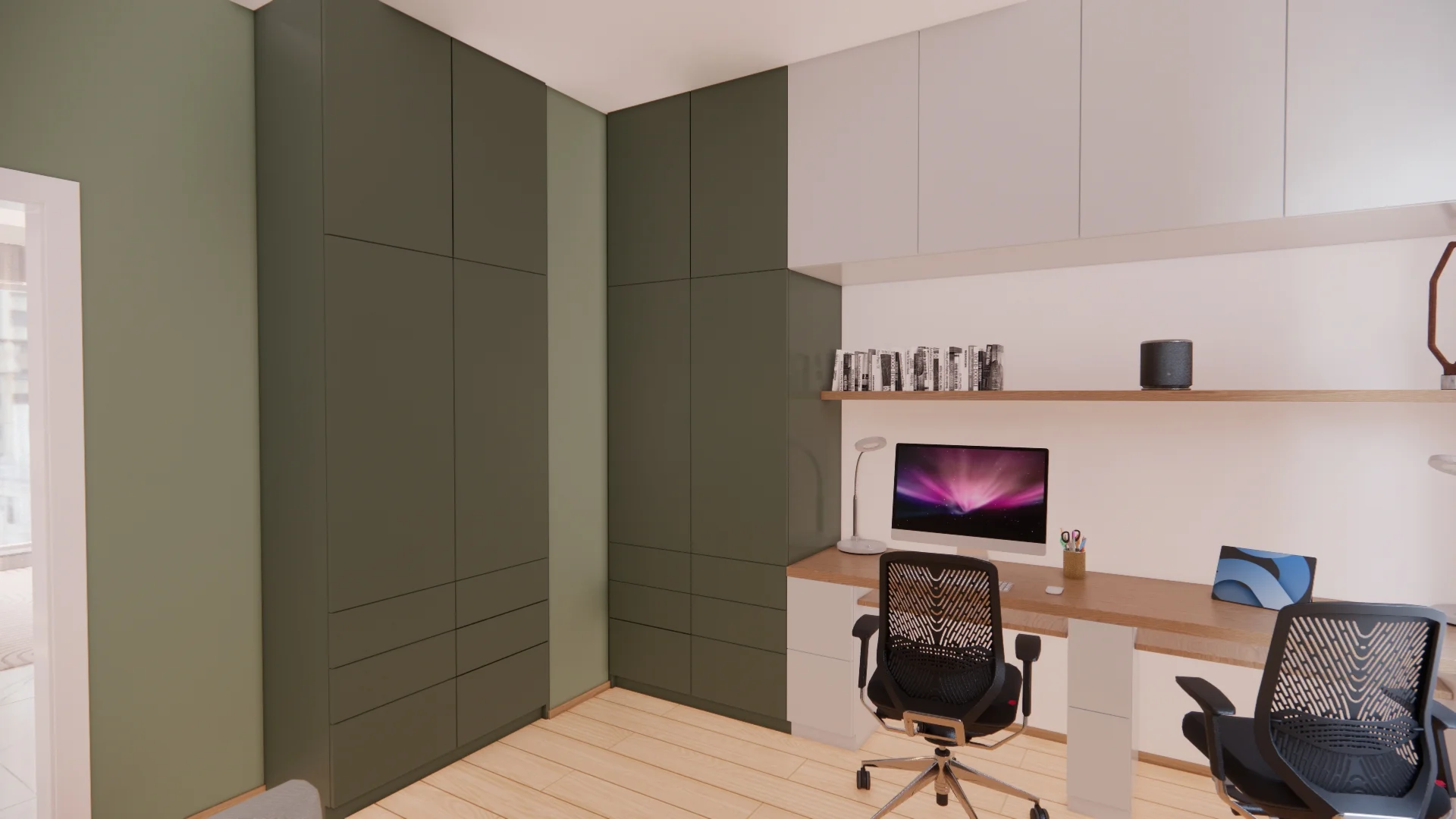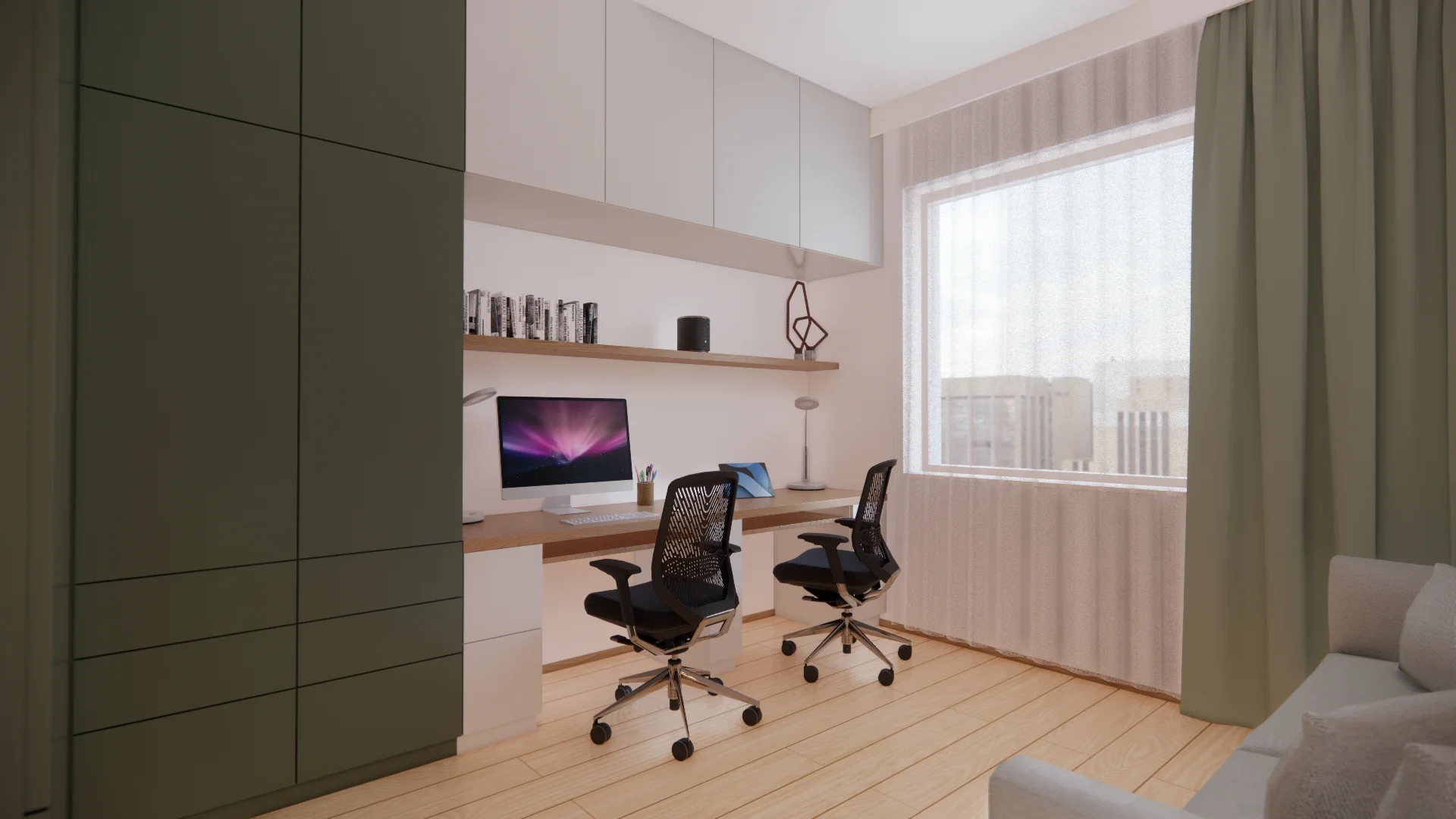 Gabinet za to zyskał kojący akcent zieleni – obszerna zabudowa meblowa z miejscem na dwa stanowiska do pracy przy komputerze. Pod ścianą wygodna rozkładana sofa, a na ścianach więcej ulubionej sztuki.