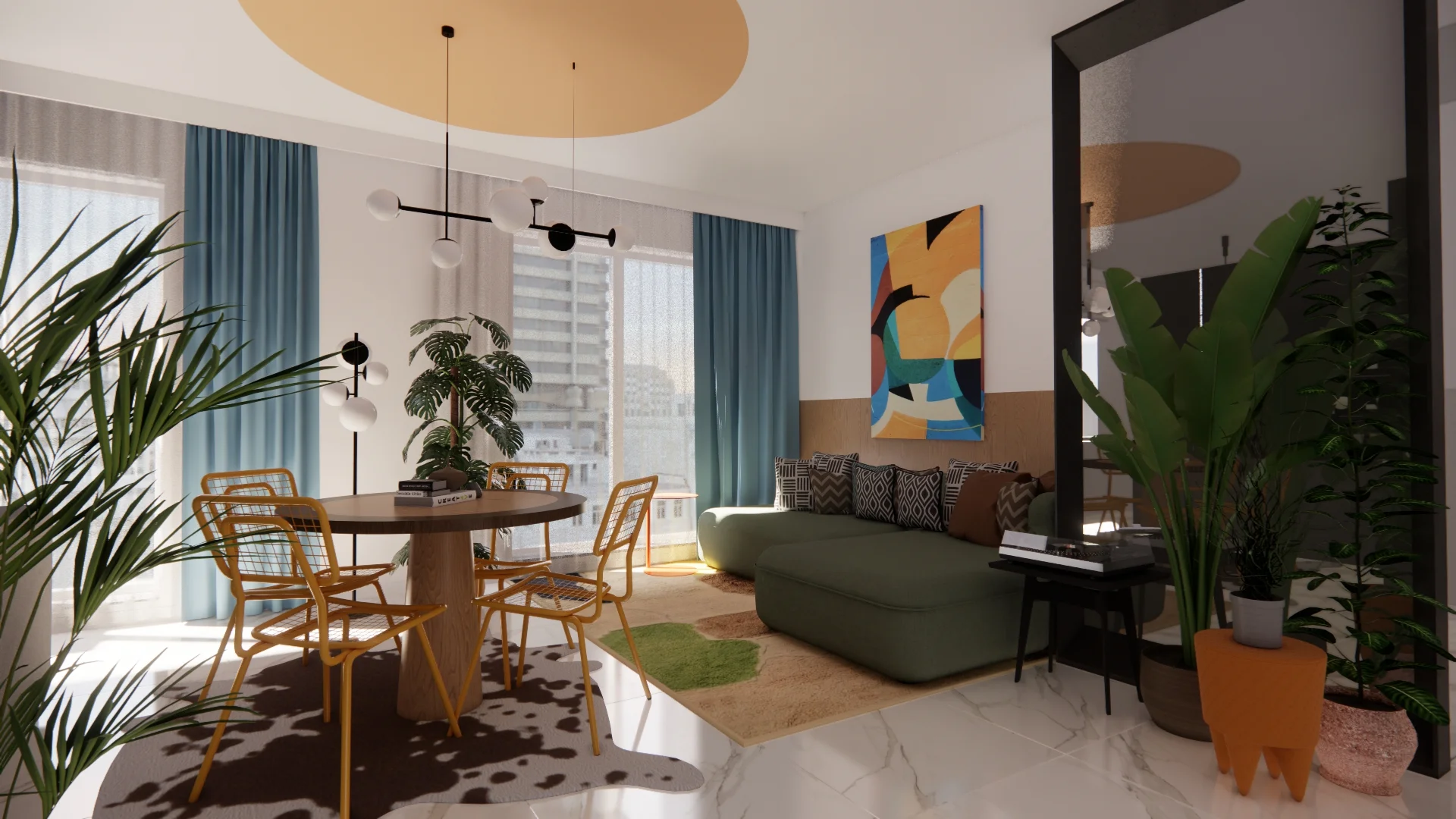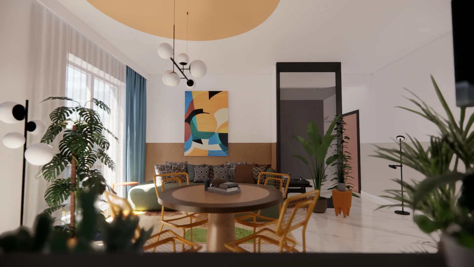 Kolorowa draperia, dywan z Maroko, drewniany stół z drugiej ręki, stare odnowione krzesła, duży kolorowy wypoczynek i akcent drewna na ścianie za kanapą. Do tego sztuka, kolorowe plakaty i rośliny doniczkowe. Zdecydowanie nie wnętrze i rozwiązanie dla każdego – ale i dla naszych inwestorów rozwiązanie tymczasowe.