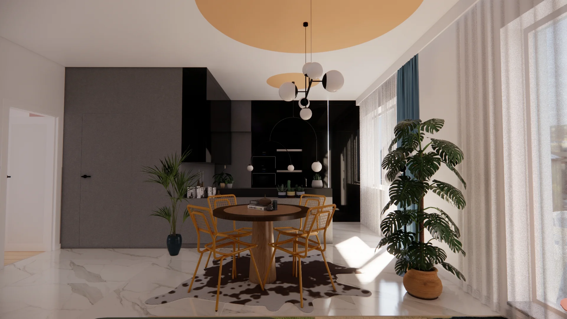 W części dziennej, gdzie zimna połyskująca podłoga i duża szara kuchnia stanowiły podstawę stylu wnętrza, postanowiliśmy dodać kolor i teksturę idąc mocno w kontrasty i styl eklektyczny.