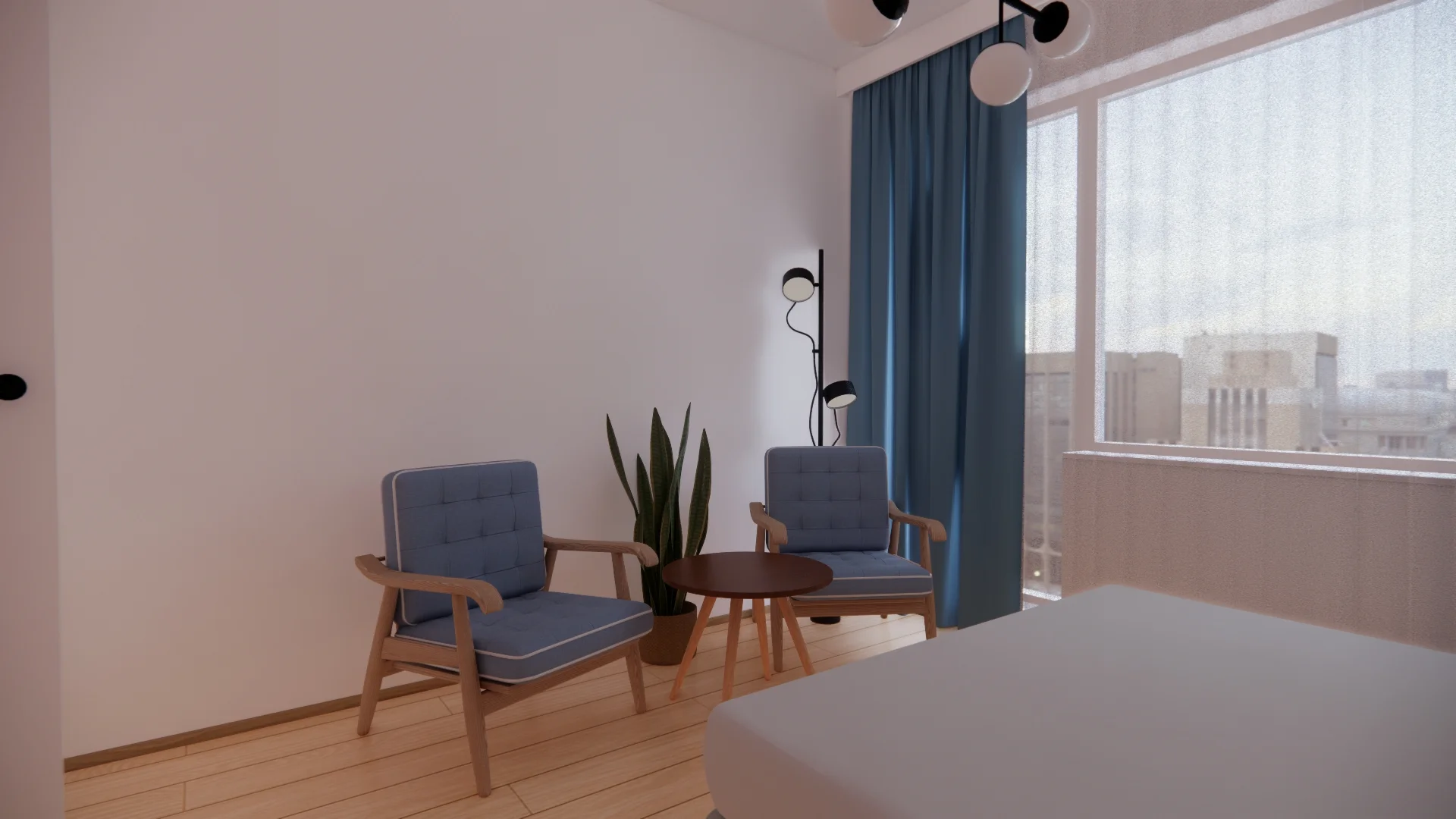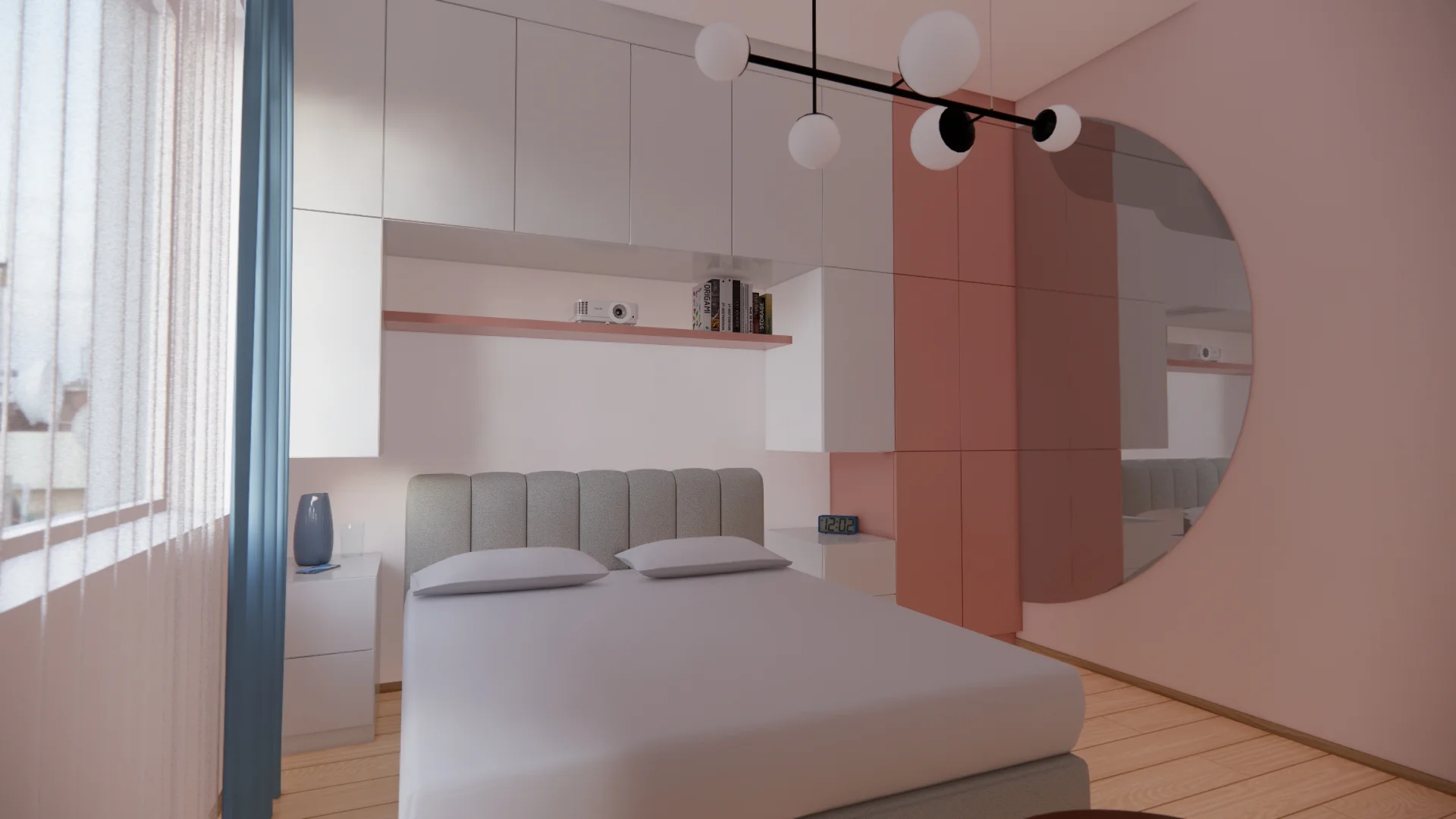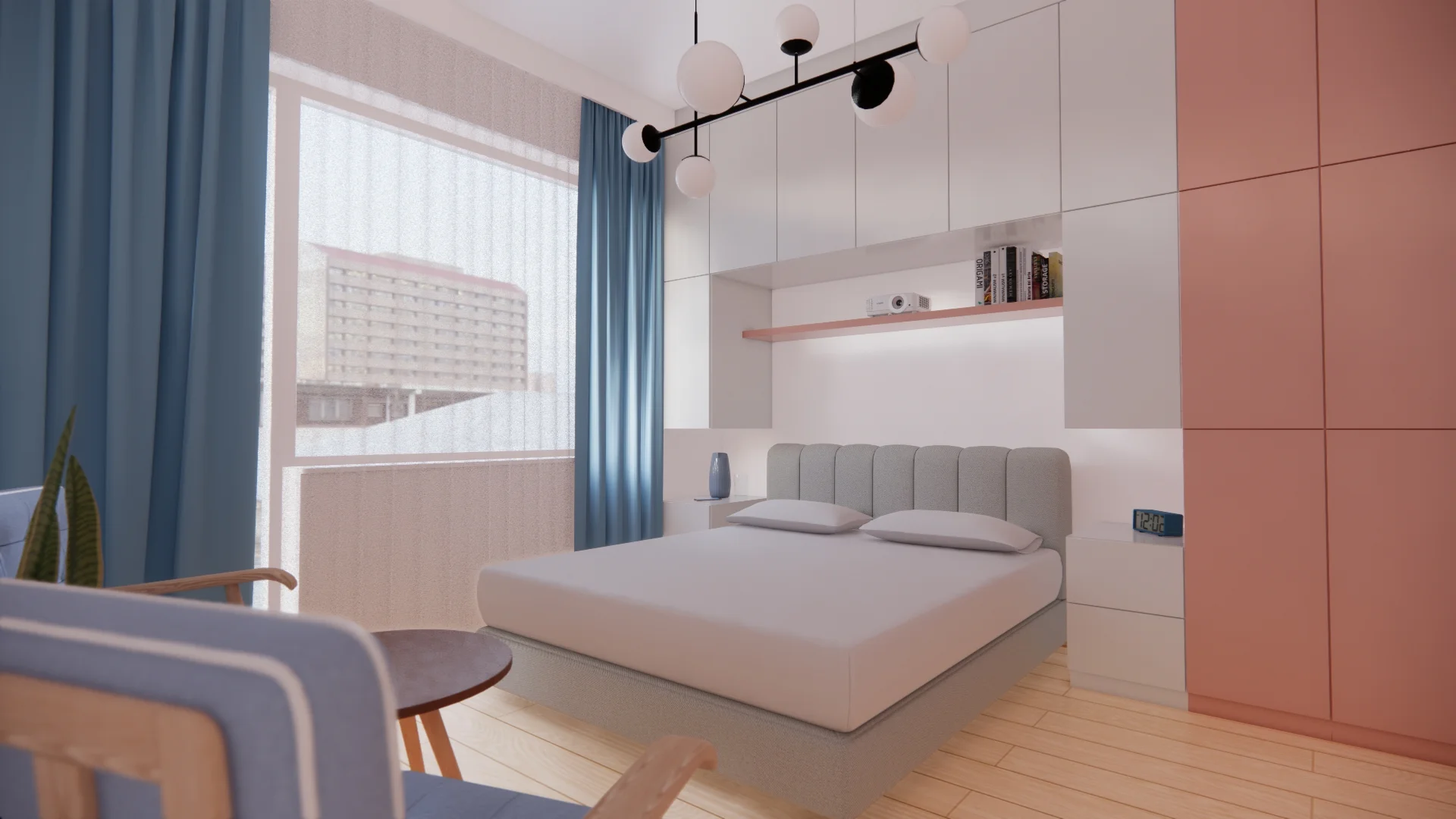 Więcej zmian pojawiło się w pokojach – sypialnia zyskała delikatny różowy akcent, nową zabudowę meblową. Zabudowa nad i obok łóżka asymetryczna, aby obok łóżka w przyszłości zmieściła się jeszcze toaletka. Przed łóżkiem miejsce na ukochane fotele, których inwestorzy nie chcieli zostawić w starym mieszkaniu.