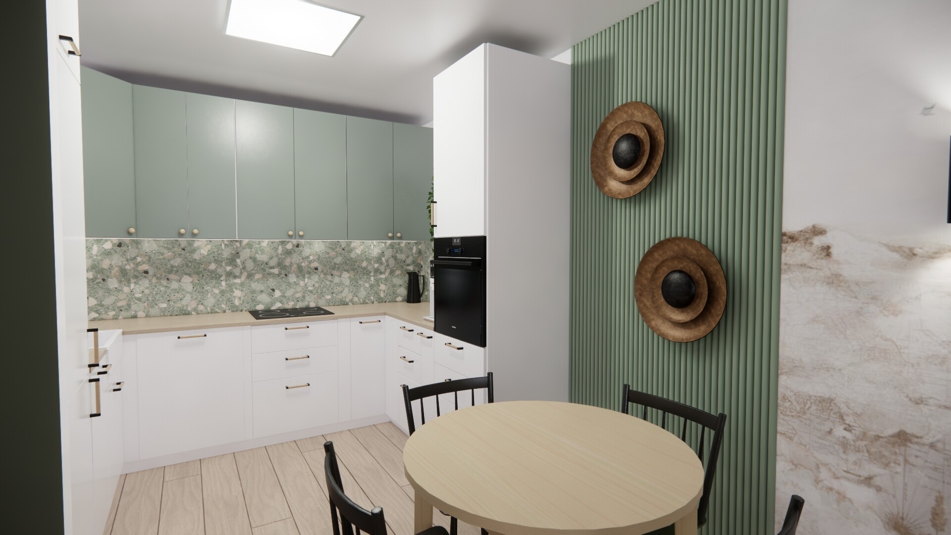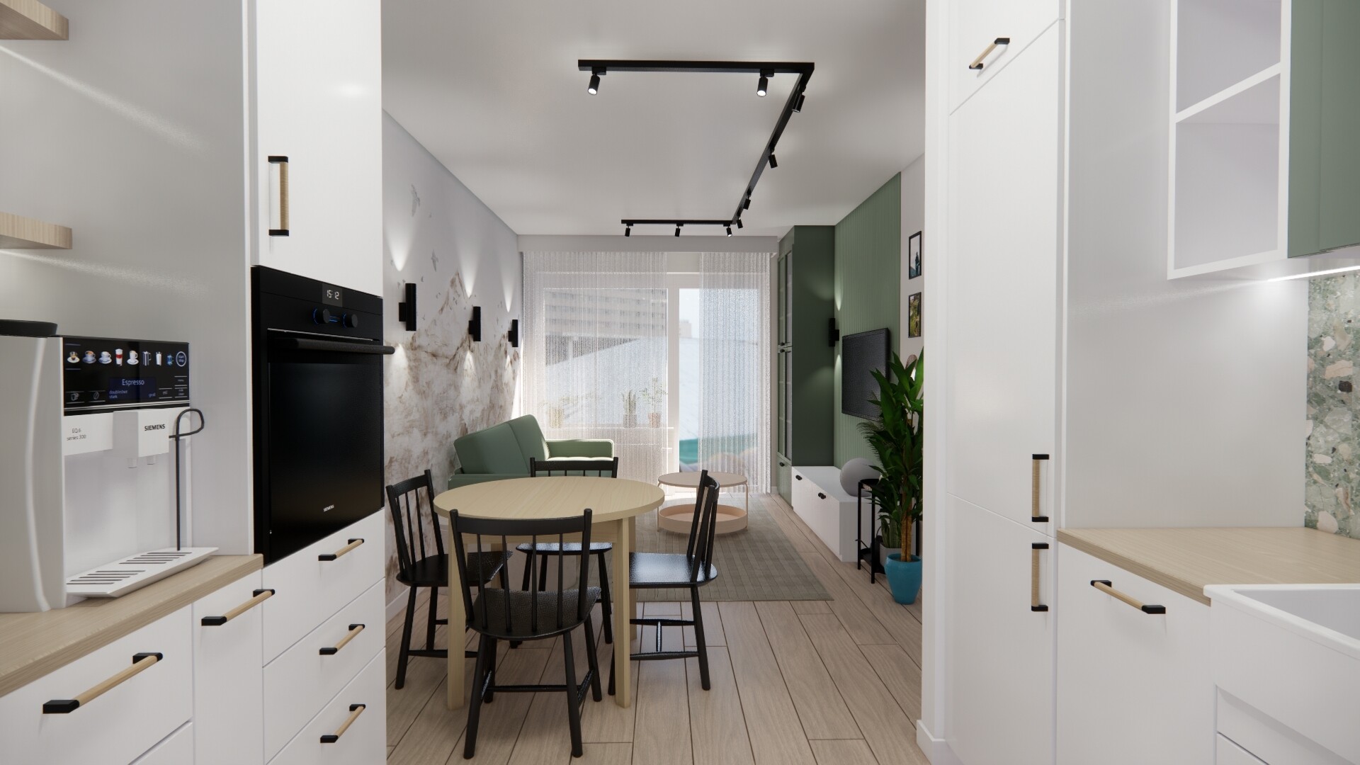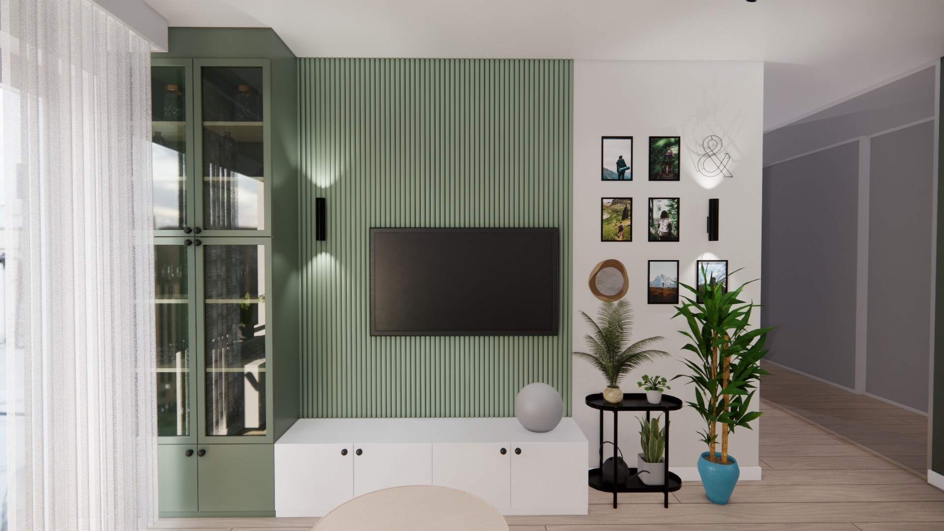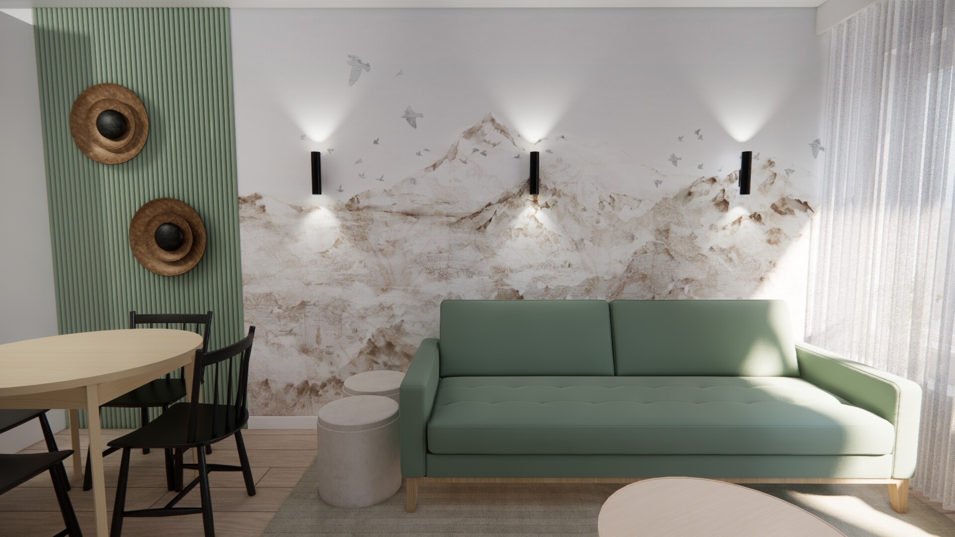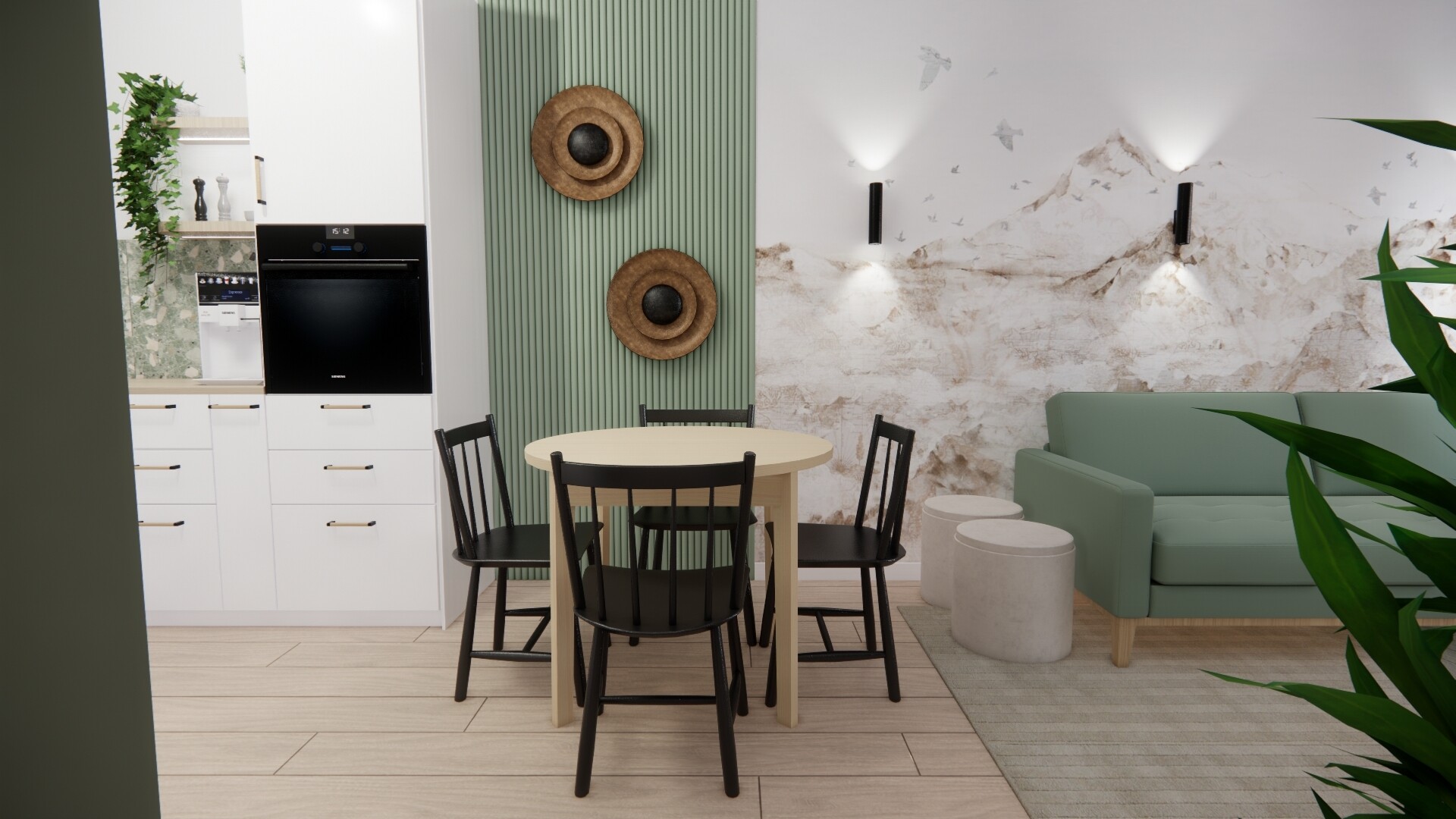 Gdzieś na jednym z wielu osiedli Wrocławia, urocza para miłośników spacerów w górach poprosiła nas o lifting salonu z aneksem kuchennym. Tęskniąc za wiosennymi górskimi krajobrazami ich głównym założeniem projektowym była ZIELEŃ!